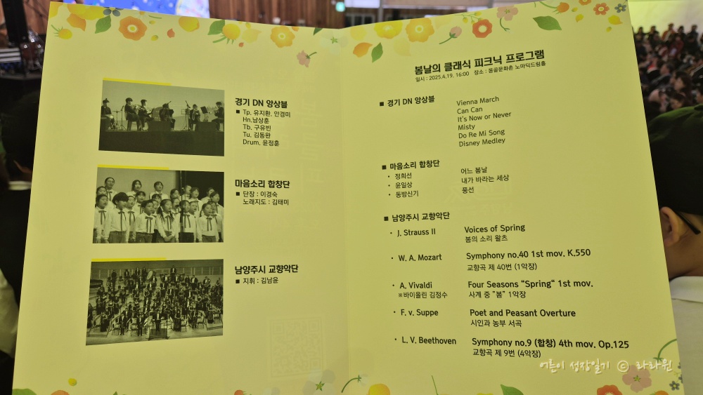 봄날의 클래식 피크닉. 제목부터 달콤하다. 공연은 경기 DN앙상블, 마음소리합창단, 남양주시교향악단의 연주로 구성되어 있었다. 남양주시 시장님부터 내외 귀빈 소개 후 공연이 시작되었다.